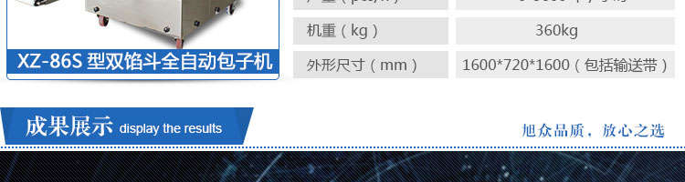 名稱XZ-86S型雙餡斗全自動(dòng)包子機(jī) 電源220/380V(見(jiàn)機(jī)器名牌) 功率2.3kw 產(chǎn)量0-3600個(gè)/小時(shí) 尺寸1600*720*1600mm(包括輸送帶) 重量360kg 規(guī)格20-150克/個(gè) 其他