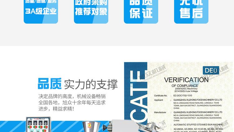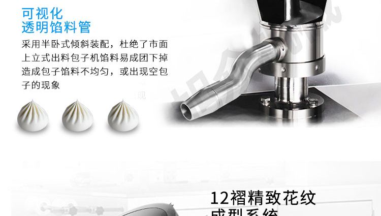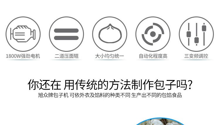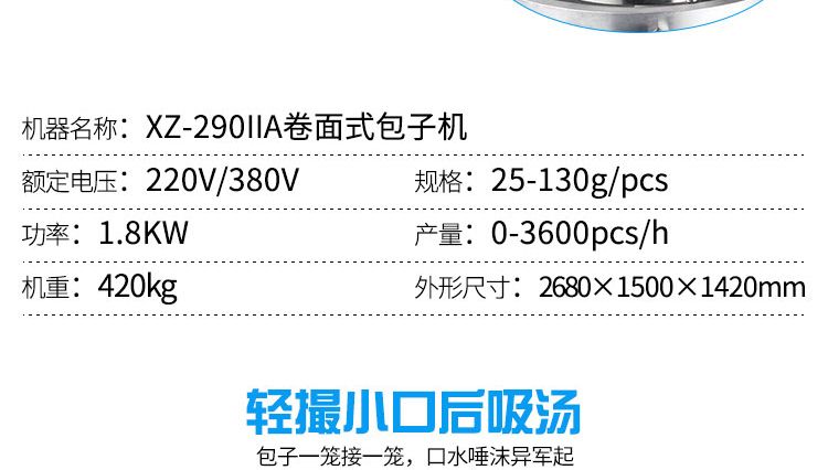 名稱XZ-290IIA卷面式包子機(jī) 電源220/380V(見機(jī)器名牌) 功率1.8kw 產(chǎn)量0-3600個(gè)/小時(shí) 尺寸2680*1500*1420mm(包括輸送帶) 重量420kg 規(guī)格25-130克/個(gè) 其他