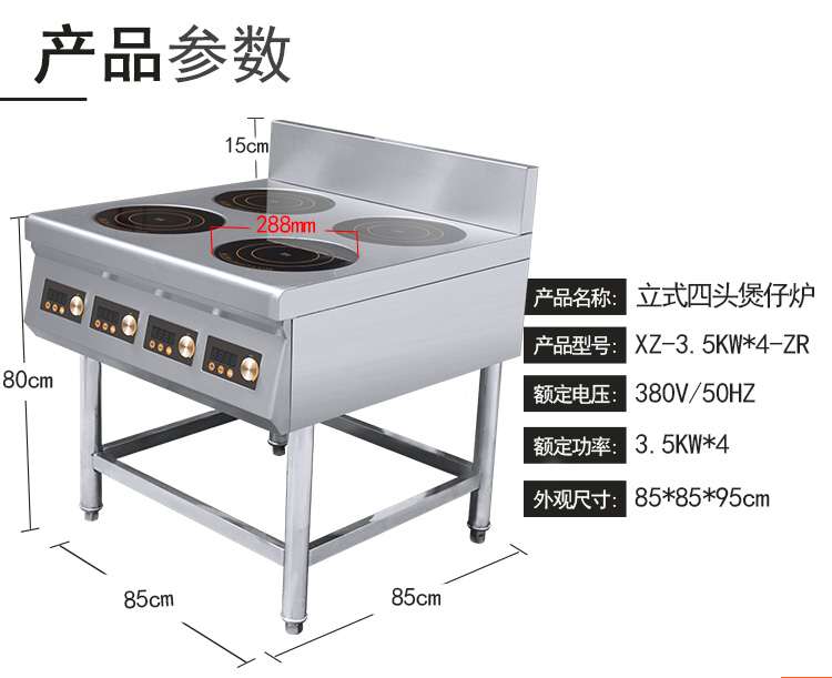 名稱(chēng)座地式四頭電磁爐 電源 功率3.5kw*4 產(chǎn)量 尺寸850×850×800/950mm 重量 規(guī)格 其他