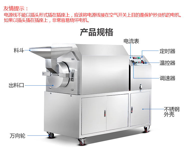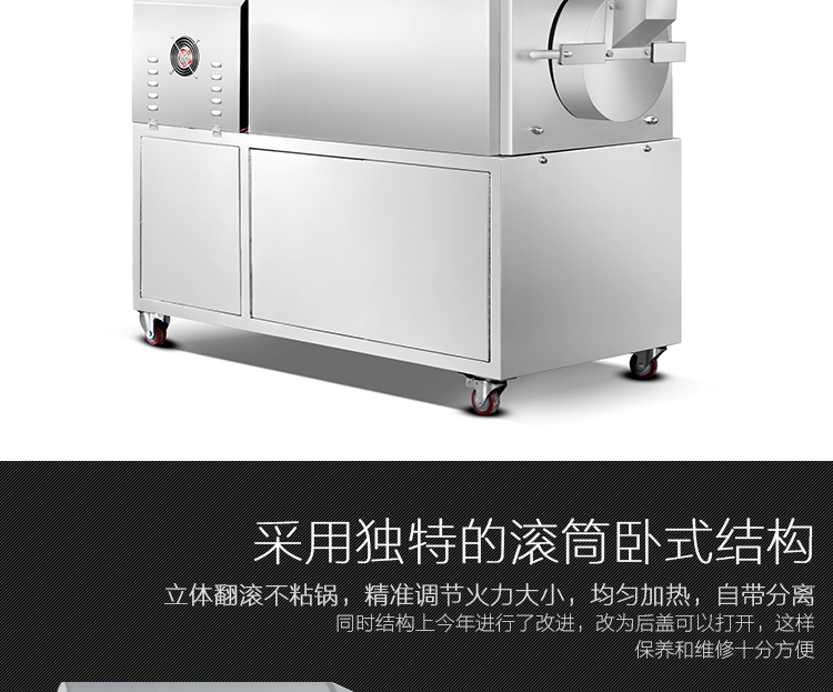 1.豪華炒貨機采用不銹鋼材質,獨特的滾筒臥式結構,加熱均勻,密封性好,燜炒效果好。同時結構上今年進行了改進,改為后蓋可以打開,這樣保養(yǎng)和維修十分方便,下料的地方增加漏斗,操作更方便!