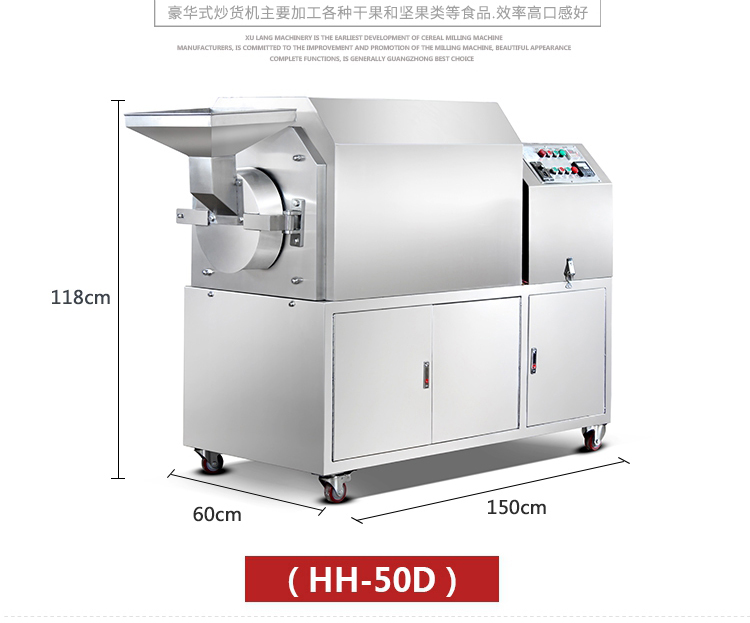 HH豪華炒貨機,適合加工各種干果和堅果類,如;板栗、花生、瓜子、松籽、榛子、杏仁、菜籽、咖啡豆、紅棗、芝麻、核桃、各種豆類、麥類、米類等。適用于在食品加工廠、農(nóng)貿(mào)市場、食品專賣店、連鎖店等處定點加工和經(jīng)營,符合生產(chǎn)、創(chuàng)業(yè)致富的需要。