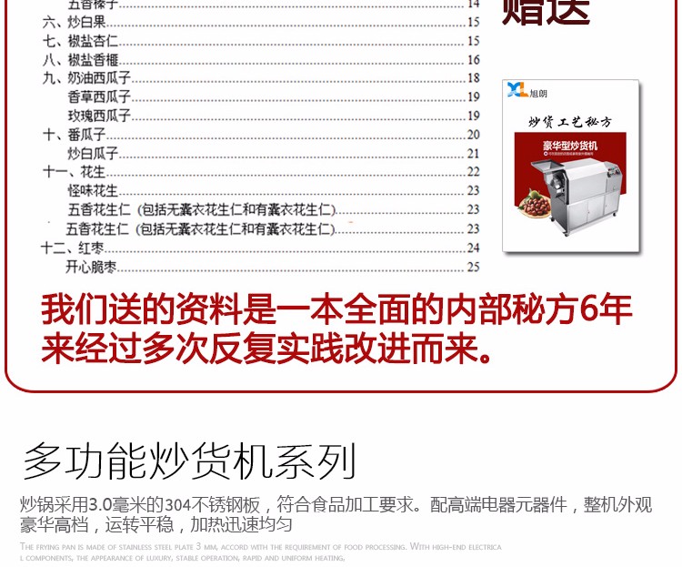 9.豪華炒貨機結構合理,操作簡單,熱效率高,所炒制食物非常均勻、口感良好!