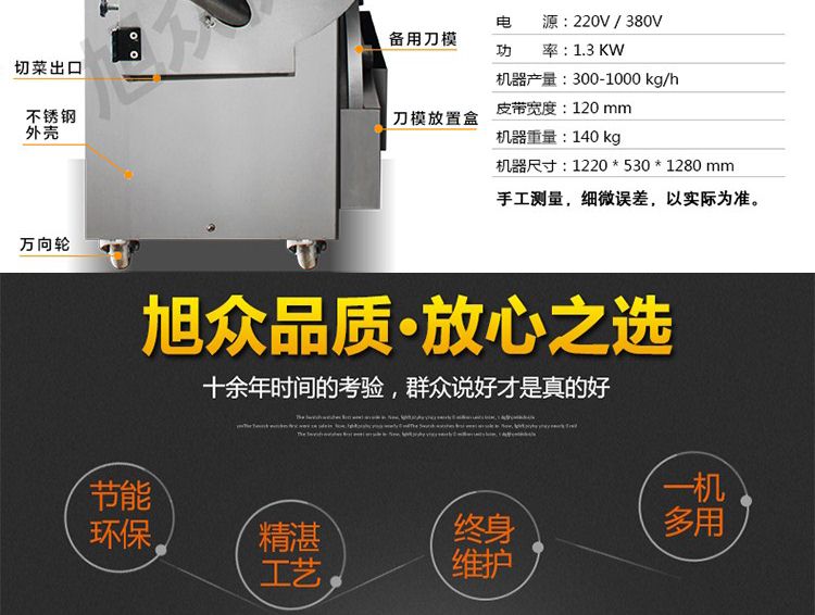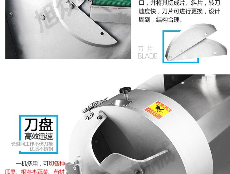 一機多用,可切葉菜及根莖類蔬菜,并可切片、絲、條、丁、段,碎等;根莖類,成品形狀:片、四角絲條、丁、斜片;葉菜類,切割尺寸:1-30mm可以調(diào)整。