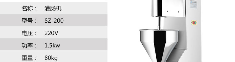 名稱SZ-200灌腸機(jī) 電源220/380V(見機(jī)器銘牌) 功率1.14-1.5kw 產(chǎn)量200千克/小時 尺寸520*390*1320mm 重量80kg 規(guī)格 其他
