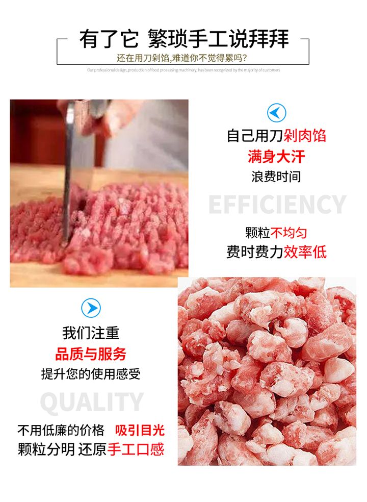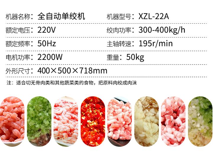 XZL-22A絞肉機(jī)吸取同行之優(yōu)點(diǎn),改進(jìn)新型絞肉切肉機(jī)械,它能切豬肉、羊肉、牛肉、魚(yú)及其它各種肉類、所切肉片厚度適中切片效率高,是餐廳、賓館、酒樓、單位食堂等絞肉切肉的理想機(jī)械,該機(jī)外形獨(dú)特,操作方便,維修簡(jiǎn)單,工作效率高,在同行業(yè)中處領(lǐng)先地位,與食物接觸部分均采用不銹鋼制造符合食品衛(wèi)生標(biāo)準(zhǔn)。
