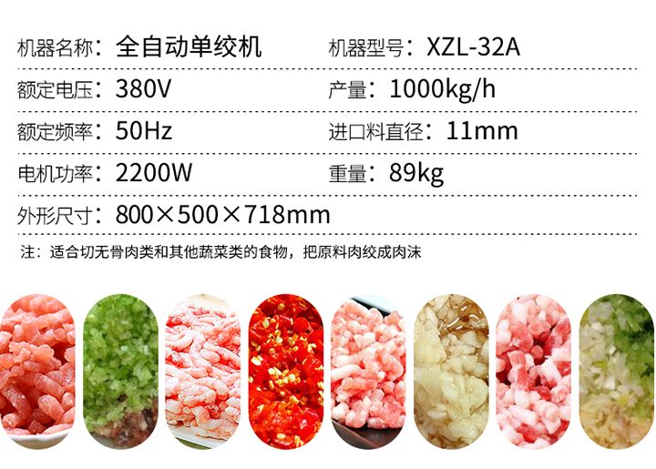 XZL-32A單絞機(jī)吸取同行之優(yōu)點(diǎn),改進(jìn)新型絞肉切肉機(jī)械,它能切豬肉、羊肉、牛肉、魚及其它各種肉類、所切肉片厚度適中切片效率高,是餐廳、賓館、酒樓、單位食堂等絞肉切肉的理想機(jī)械,該機(jī)外形獨(dú)特,操作方便,維修簡單,工作效率高,在同行業(yè)中處領(lǐng)先地位,與食物接觸部分均采用不銹鋼制造符合食品衛(wèi)生標(biāo)準(zhǔn)。
