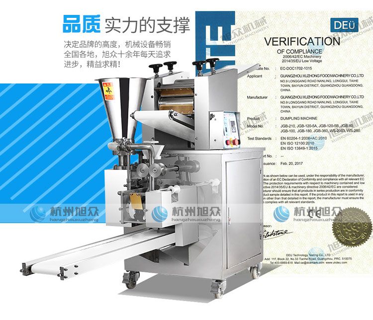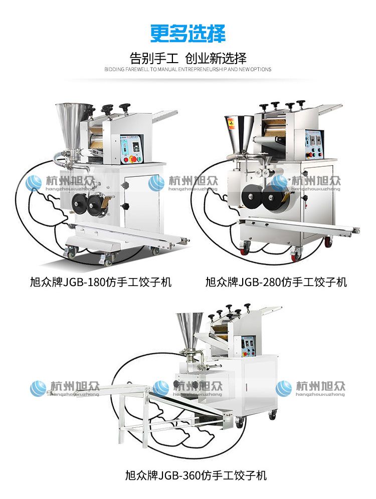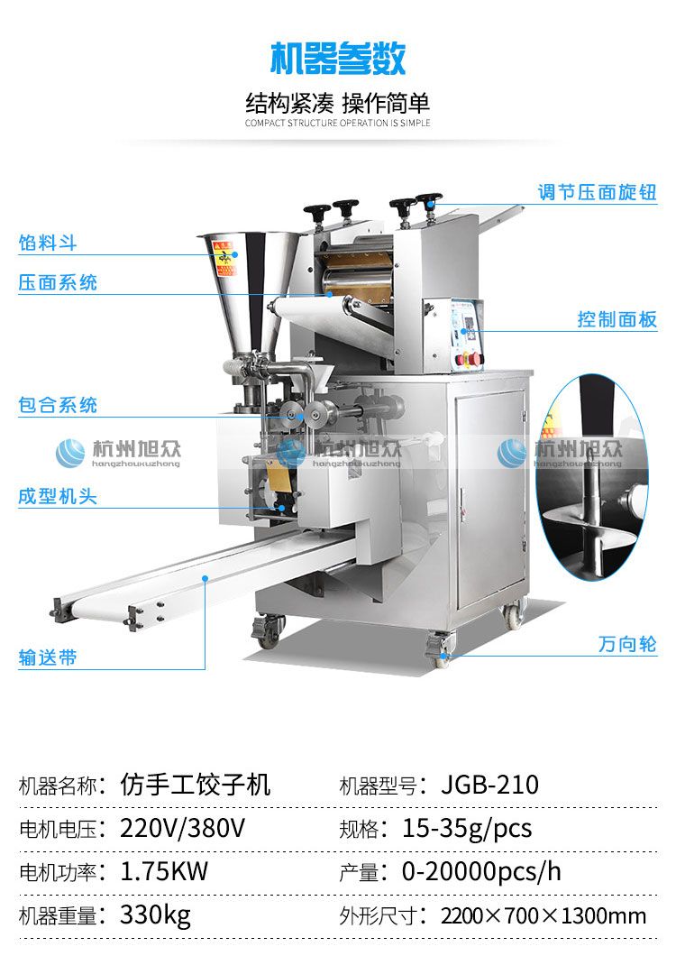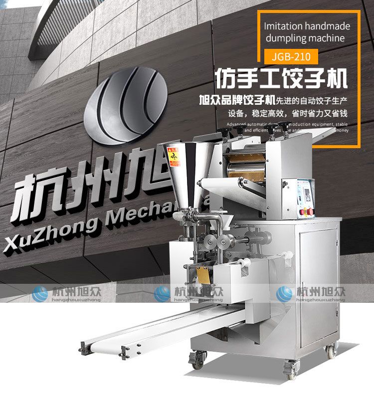 旭眾牌JGB-210型仿手工餃子機(jī)是我公司研發(fā)生產(chǎn)的先進(jìn)自動(dòng)餃子生產(chǎn)設(shè)備。本機(jī)采用自動(dòng)壓面皮包餃子的新工藝技術(shù),克服了舊式餃子機(jī)絞龍強(qiáng)力擠壓而帶來(lái)的對(duì)面筋的損傷,面團(tuán)不會(huì)發(fā)熱,不會(huì)糊化,餃子口感佳。