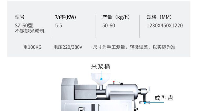 名稱SZ-60不銹鋼米粉機 電源220/380V 功率5.5kw 產(chǎn)量50-60kg/h 尺寸1230*450*1220mm 重量100kg 規(guī)格 其他