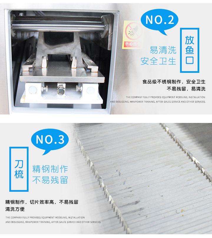 1、魚片斜切一次成型,可加工大、中、小各種鮮魚。