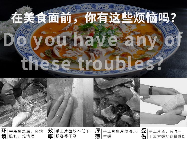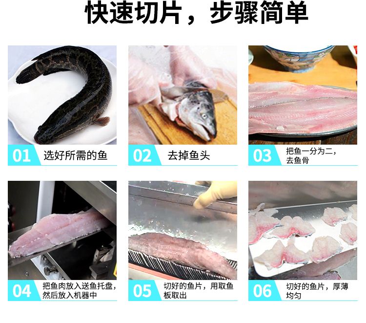 1、魚片斜切一次成型,可加工大、中、小各種鮮魚。