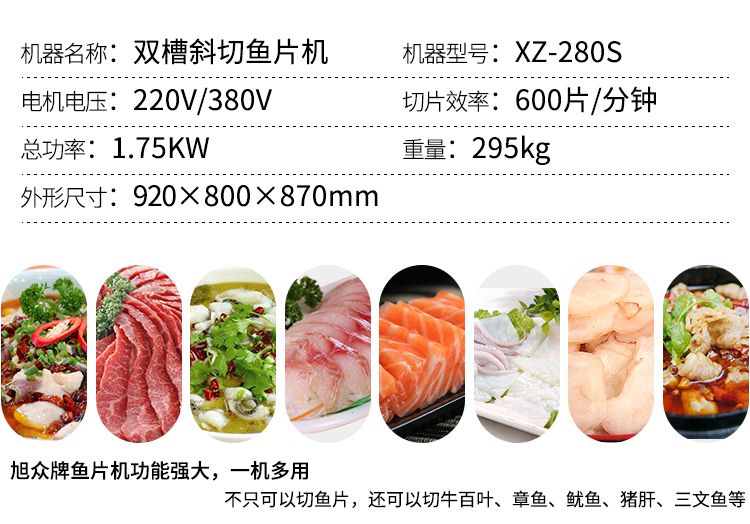 名稱XZ-280S全自動(dòng)切魚片機(jī) 電源220V/380V 功率1.75KW 產(chǎn)量600片/min 尺寸920×800×870mm 重量295kg 規(guī)格 其他