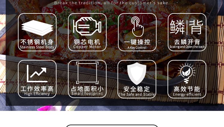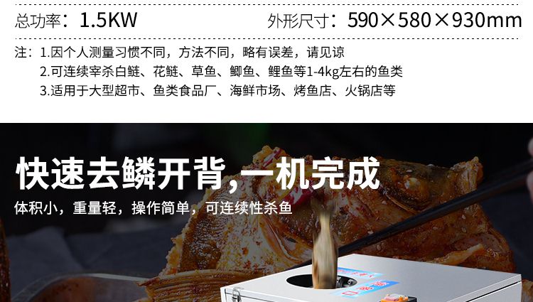 本設(shè)備為魚類食品加工廠,大型超市,機(jī)關(guān)食堂,海鮮市場,農(nóng)貿(mào)市場,烤魚店,酸菜魚店,火鍋店等餐飲酒店帶來高工作效率。