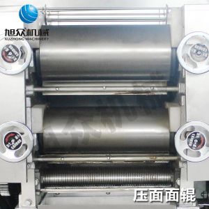 將攪拌好的面粉均勻的放進(jìn)去,面對(duì)輥將松散的面粉初壓成面皮,合皮部分有一對(duì)軋輥,它將兩層復(fù)合面皮合成一層,延軋部分由兩對(duì)軋輥組成,將面皮軋成所需的厚度,切條部分是將一定厚度的面皮切成所需寬度的面條,上門架部分把切斷后的面條自動(dòng)挑起。