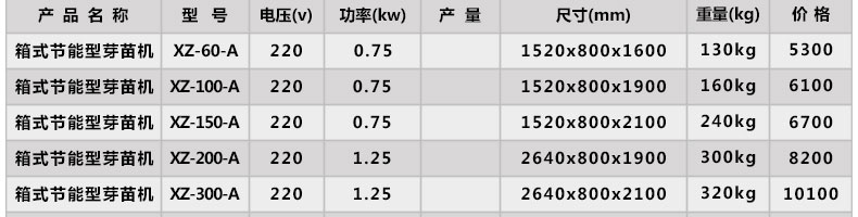 型號 | 工作電壓 | 耗水量 | 日耗電(度) | 功率 | 育苗箱 | 重量 | 外形尺寸 |