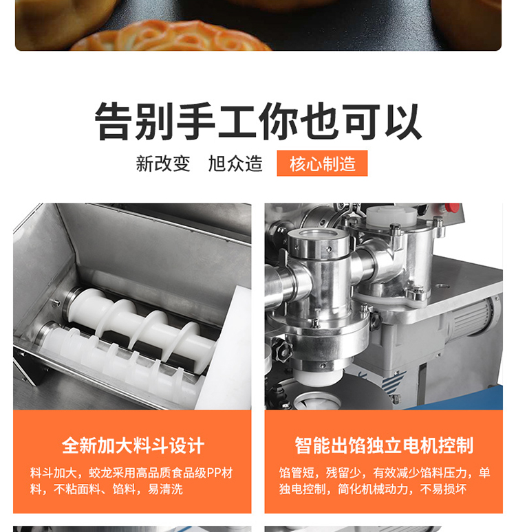 2.餡管更短,管內存料少,減小出餡壓力,有效保護餡料顆粒,使餡料更松散、產品重量、皮餡比例更加穩(wěn)定,適用多種餡料;