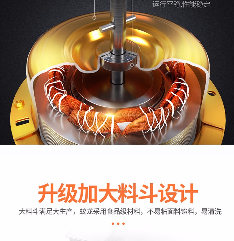 5.料斗加大,蛟龍采用高品質食品級PP材料,不粘面料、餡料,易清洗;
