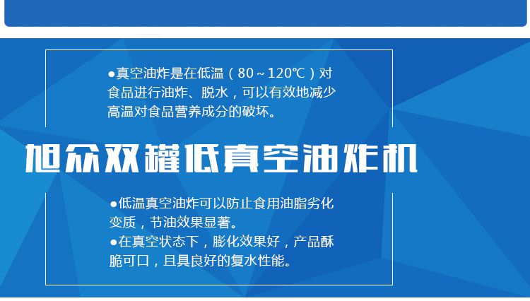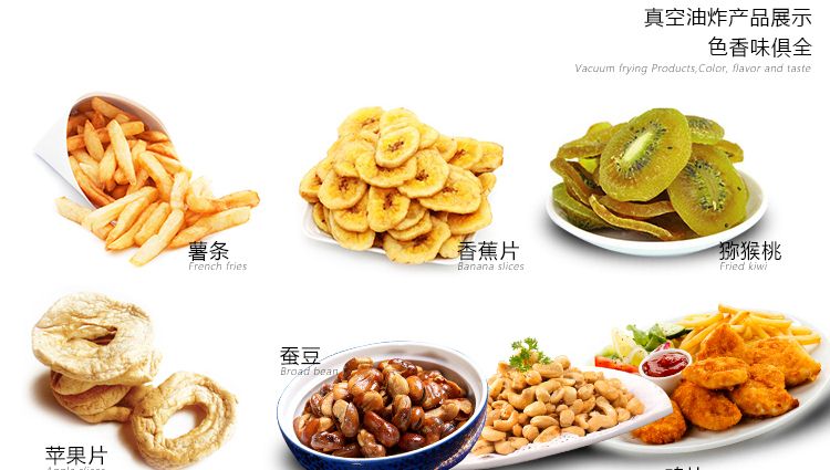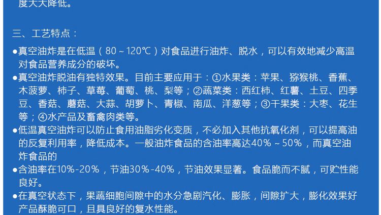 ●真空油炸是在低溫(80~120℃)對食品進(jìn)行油炸、脫水,可以有效地減少高溫對食品營養(yǎng)成分的破壞。